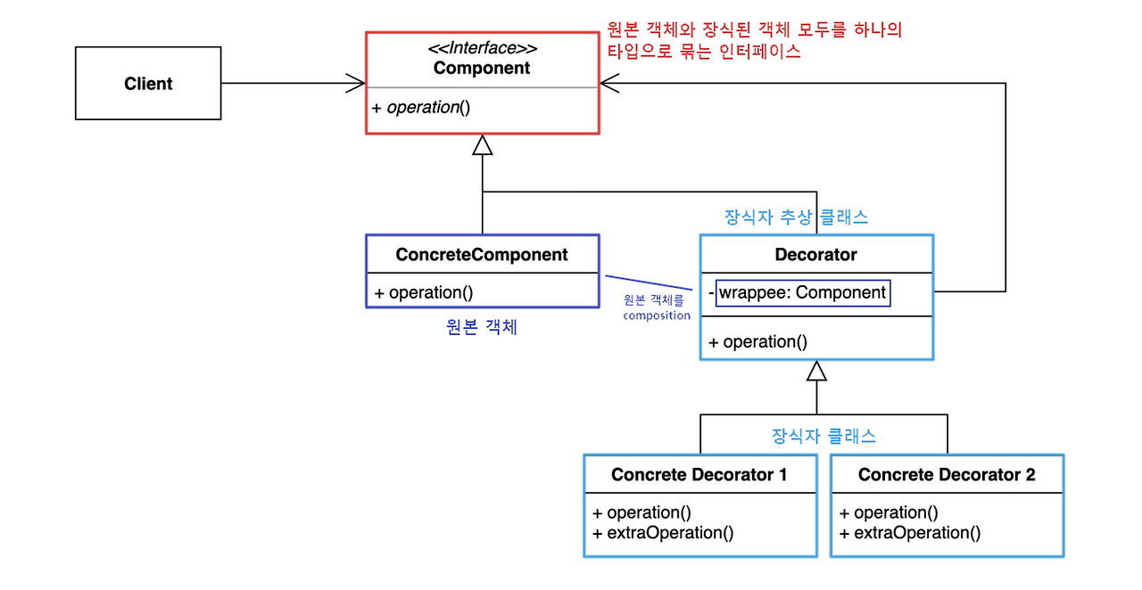 여기서, 데코레이터(Decorator) 는 디자인 패턴 중 하나로 대상 객체에 대한 기능 확장이나 변경이 필요할 때 객체의 결합을 통해 서브클래싱 대신 사용할 수 있는 패턴이다.