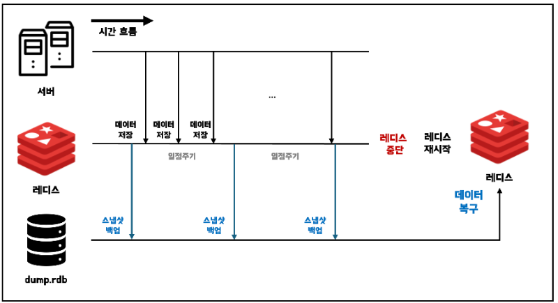 - 스냅샷을 저장하는 시점 사이의 데이터 변경 사항은 유실이 있을 수 있다.